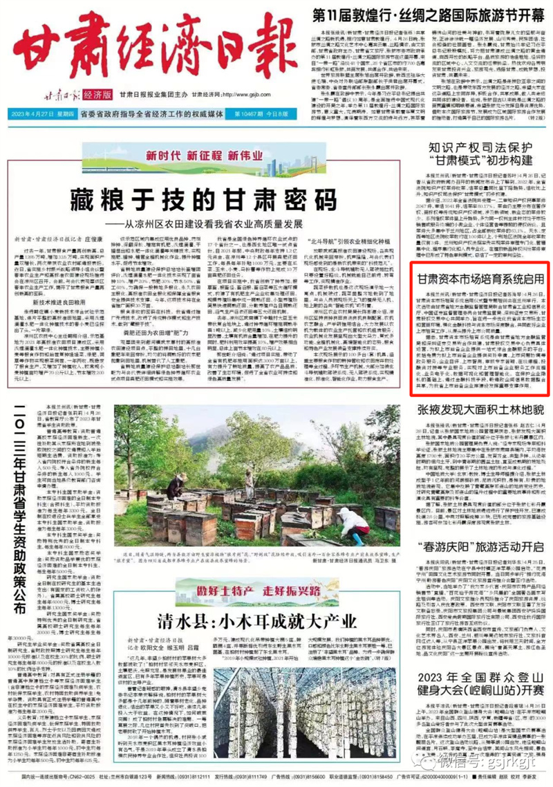 新甘肅客戶端蘭州訊(新甘肅·甘肅經(jīng)濟日報記者 蘇海琴)4月26日,甘肅資本市場培育系統(tǒng)啟用儀式暨專題培訓(xùn)會在蘭州舉行。本次活動由甘肅省地方金融監(jiān)督管理局聯(lián)合甘肅省工業(yè)和信息化廳、中國證券監(jiān)督管理委員會甘肅監(jiān)管局、深圳證券交易所、甘肅股權(quán)交易中心共同舉辦,旨在進一步優(yōu)化我省資本市場生態(tài)和營商環(huán)境,強化金融科技與資本市場深度融合,共同做好企業(yè)上市培育工作,從源頭提升上市公司質(zhì)量。