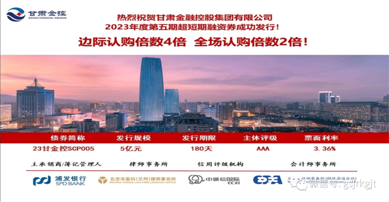 2023年12月14日,甘肅金控集團成功發(fā)行2023年度第五期超短期融資券,發(fā)行規(guī)模5億元,債券期限180天,票面利率3.36%。本次債券發(fā)行獲得了銀行、券商、公募基金等金融機構(gòu)的踴躍認(rèn)購,邊際認(rèn)購倍數(shù)4倍,全場認(rèn)購倍數(shù)2倍。