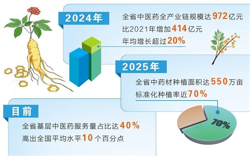如今,全省已建立起覆蓋省、市、縣、鄉的中醫藥服務體系,實現所有綜合醫院中醫藥服務全覆蓋,基層醫療衛生機構中醫館全覆蓋,中醫適宜技術推廣使用全覆蓋,基層中醫藥服務量占比達40%,高出全國平均水平10個百分點,真正做到讓人民群眾“方便看中醫、放心吃中藥”。