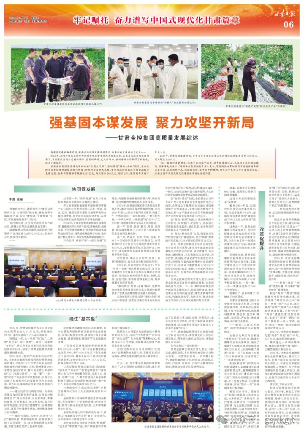 2025年,甘肅金控集團聚焦企業高質量發展,提出五個加力:在提升服務實體經濟質效上再加力、在深化改革激發發展動能上再加力、在守牢底線推動風險化解上再加力、在內外聯動實現融合發展上再加力、在提升投融資能力和水平上再加力。