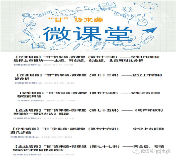 為保證培育任務不停擺、不斷檔,甘肅股權交易中心持續推進培訓工作,開辟線上培訓、講座新路徑。第一季度已累計舉辦線上培訓講座18場,培育667人次。一方面通過“甘”貨來襲·微課堂開展上市融資、專精特新政策導向等方面解讀,精準解答中小企業發展中遇到的困惑;另一方面利用科融通云講堂系列培訓課程及心流慧估“專精特新”企業服務系列培訓課程,深入剖析新階段行業趨勢和機遇,助力企業長期高速發展。