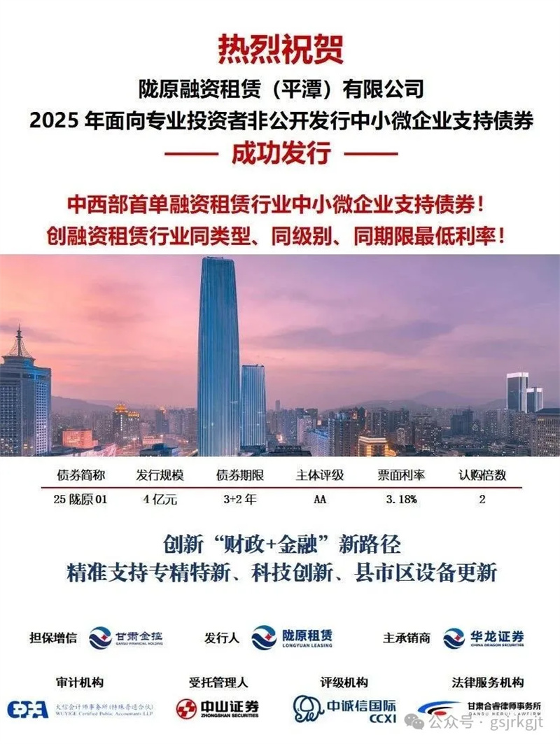 隴原租賃充分依托甘肅金控集團“財政+金融”模式優勢,以財政政策引導、金融服務協同、投融資聯動等方式,吸引資本市場資金全力支持我省實體經濟。7月28日,隴原租賃在上交所成功發行中小微企業支持債券,規模4億元,期限3+2年,票面利率3.18%,認購倍數2倍,是中西部省份首單融資租賃行業中小微企業支持債券,創融資租賃行業同類型、同級別、同期限歷史最低利率。